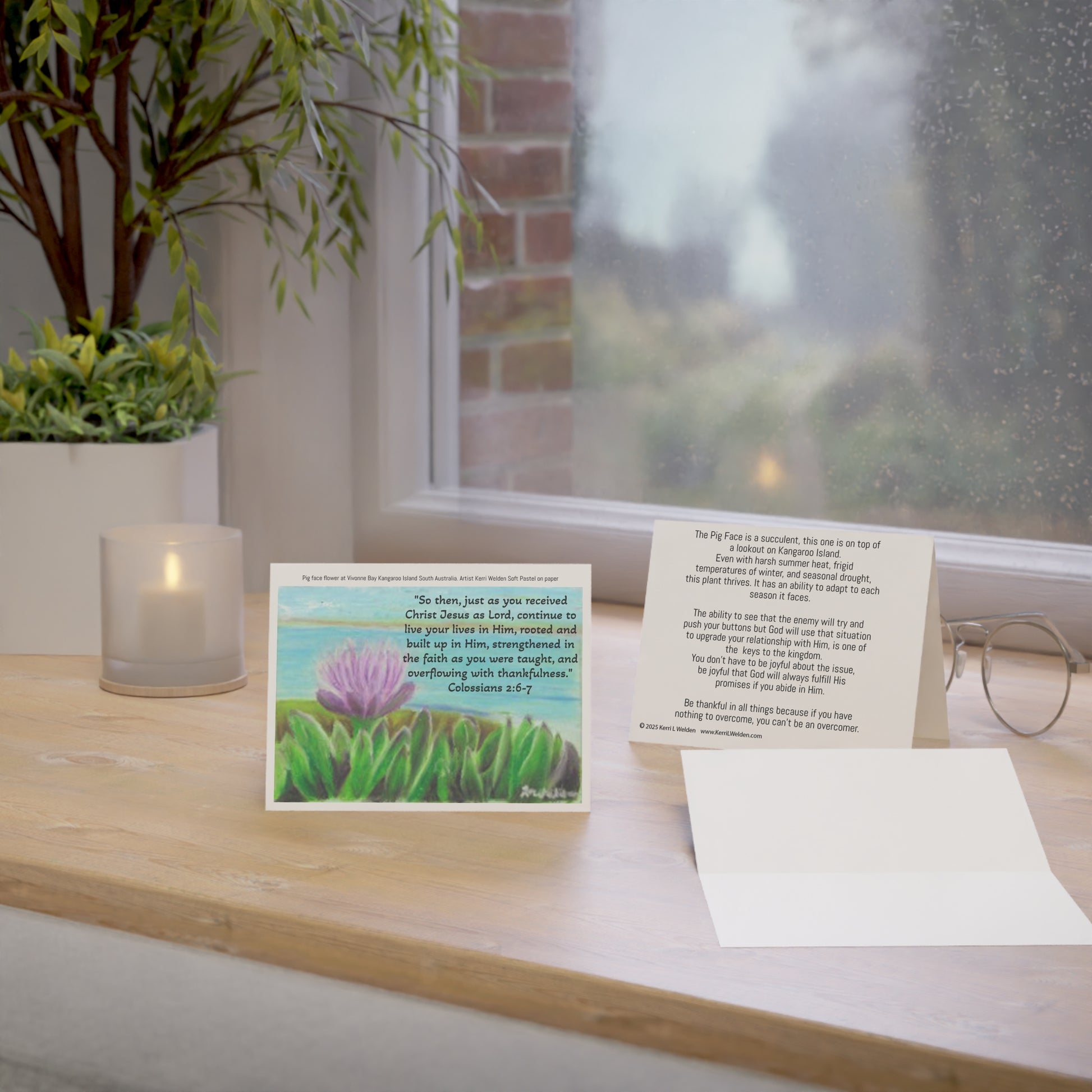 Vibrant and colorful greeting cards featuring Colossians 2:6-7 on front with a pig face flower at Vivonne Bay Kangaroo Island, South Australia and a prophetic word printed on the back, with a Pastel painting by Australian artist Kerri Welden. Perfect for sending heartfelt messages to loved ones, these cards are high-quality and come in various finishes and sizes. Ideal for those who appreciate art and spirituality, these greeting cards are relevant for all occasions