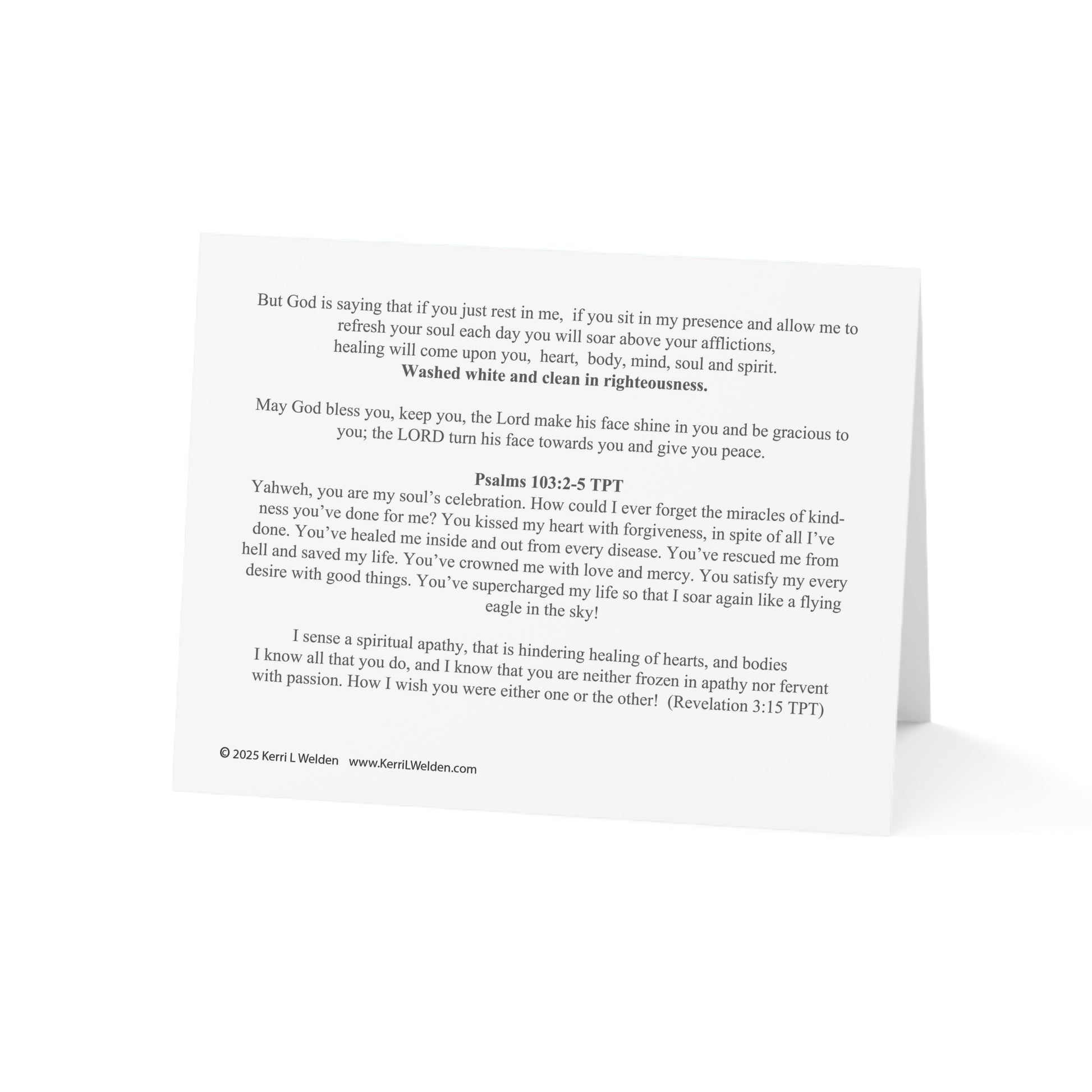 Vibrant and colorful greeting cards featuring a prophetic word on Healing printed on the back, with an acrylic painting by Australian artist Kerri Welden of an eagle. Perfect for sending heartfelt messages to loved ones, these cards are high-quality and come in various finishes and sizes. Ideal for those who appreciate art and spirituality, these greeting cards are relevant for all occasions